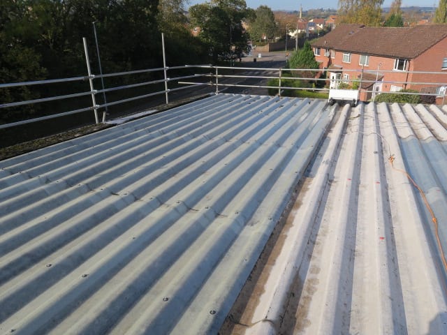 This is more like a membr. Though asbestos is water resistant the fibres will be carried into the building below by the water and once dry can become suspended in the air and inhaled. The drainage for the roof runs down the middle to the back of the garage and the roof itself is a very shallow v shape sloping towards the central drainage.